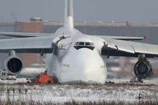 After having been left sitting in the snow at the end of Novosibirsk-Tolmachevo Airport (OBV) runway 07/25 for just over two weeks following a crash landing, the Volga-Dnepr An-124 was finally removed with the aid of a couple of tanks. Because only the nose landing gear was damaged when the aircraft overran the runway, workers could drag the monster plane back onto the runway with the aid of two BREM-1 armored repair and recovery vehicles.
